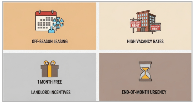 Renting between October and March—the slower rental season—gives you leverage. With fewer renters actively looking, landlords and brokers may be more willing to waive or reduce the broker fee just to fill a vacancy.